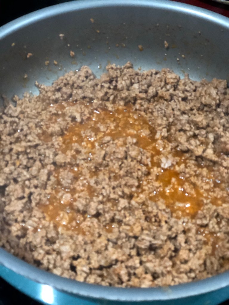 - Brown your ground beef and drain off grease. Add taco seasoning and follow directions on back of package.