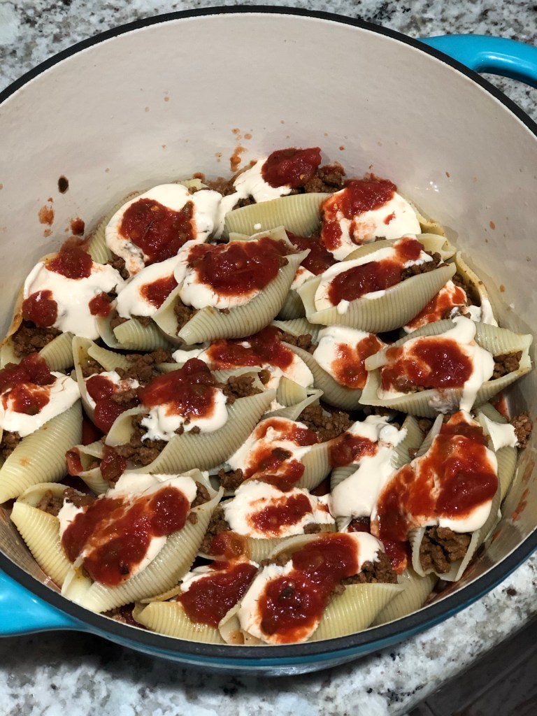 - Take your shells and stuff them with the meat. Once stuffed place in pan.