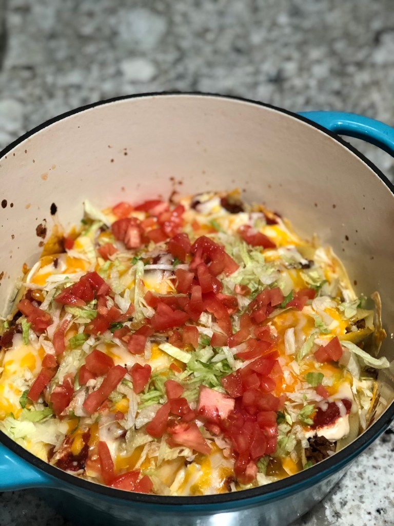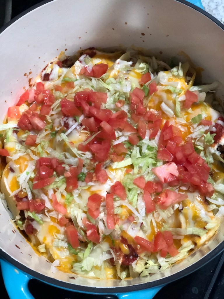 - Once it has been removed from the oven, top with shredded lettuce, diced tomatoes, cheese, and any other toppings you may desire.
